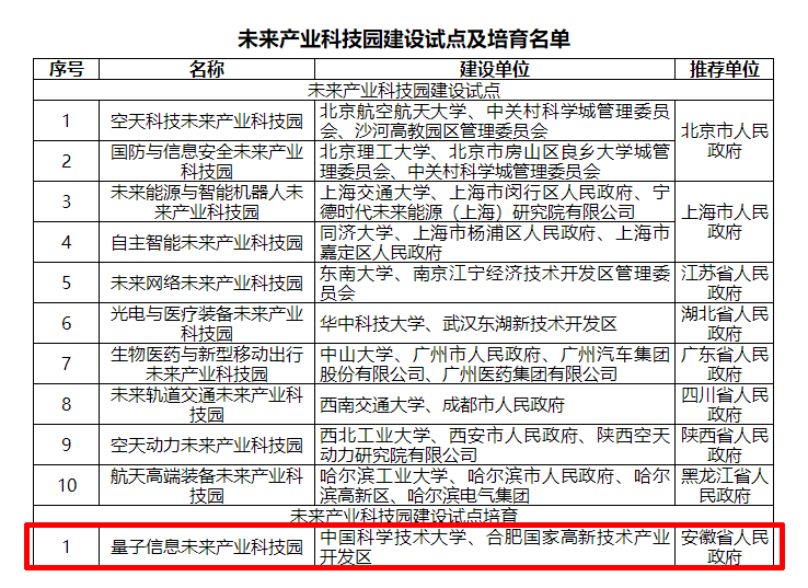 11月28日,科技部、教育部發(fā)布《科技部教育部關于批復未來產(chǎn)業(yè)科技園建設試點的函》。批復未來產(chǎn)業(yè)科技園建設試點及培育名單,11家科技園入圍,其中依托中國科大和合肥高新區(qū)共建的量子信息未來產(chǎn)業(yè)科技園,成功獲批建設試點培育。