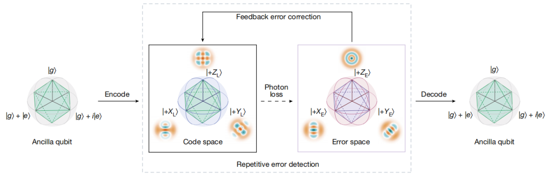 為攻克上述難題,聯(lián)合研究團(tuán)隊(duì)利用微波簡諧振子或玻色模式系統(tǒng)中的無窮維希爾伯特空間,實(shí)現(xiàn)量子信息的冗余編碼與量子糾錯(cuò)。在超導(dǎo)量子線路系統(tǒng)中,基于玻色編碼的量子糾錯(cuò)方案具有錯(cuò)誤類型簡單、錯(cuò)誤探測(cè)方便、相干性能好、硬件更高效、反饋控制易實(shí)現(xiàn)等優(yōu)點(diǎn)。