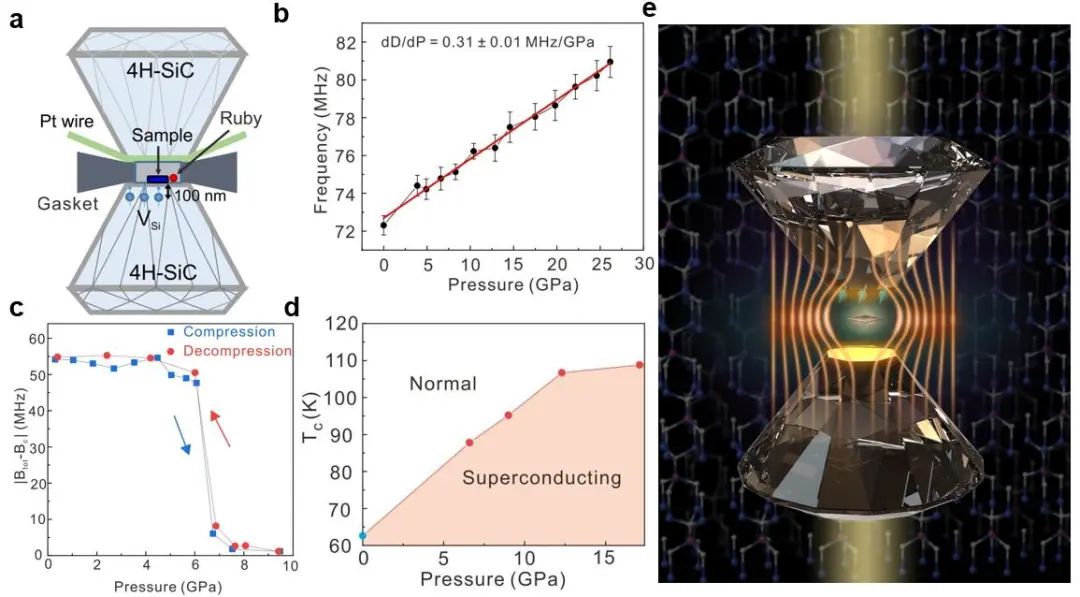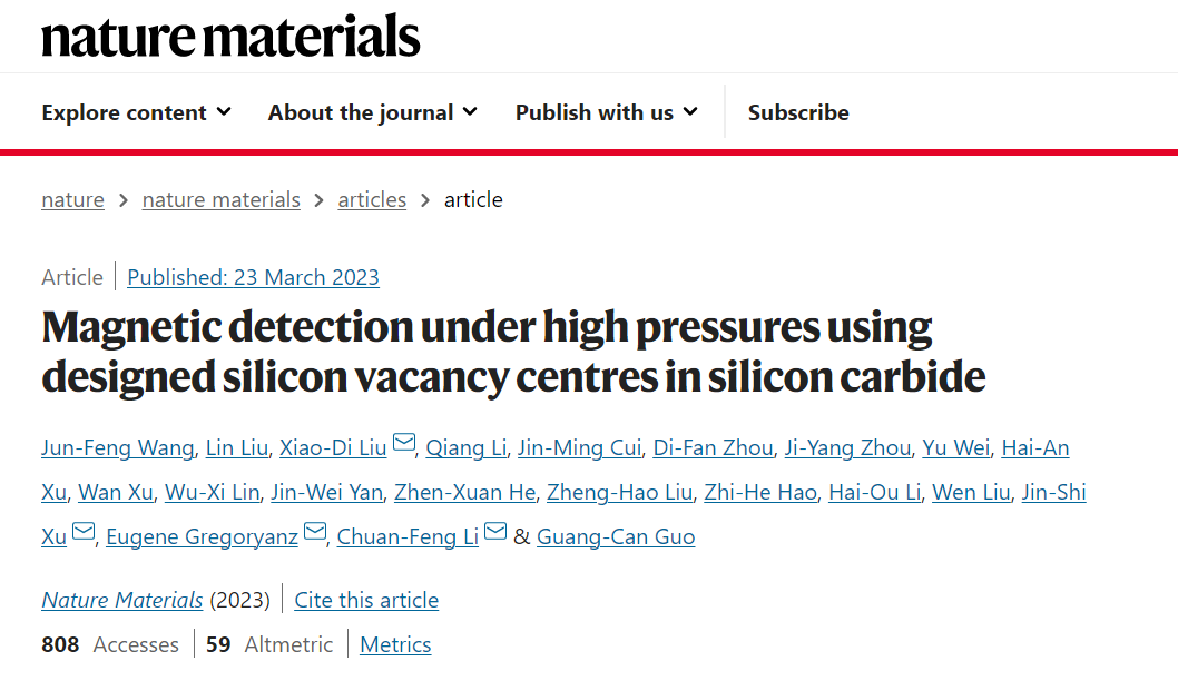 近期,依托中國科學(xué)技術(shù)大學(xué)組建的中科院量子信息與量子科技創(chuàng)新研究院郭光燦院士團隊在碳化硅色心高壓量子精密測量研究中取得重要進展。該團隊李傳鋒、許金時、王俊峰等人與中科院合肥物質(zhì)科學(xué)研究院固體所高壓團隊劉曉迪研究員等合作,在國際上首次實現(xiàn)了基于碳化硅中硅空位色心的高壓原位磁探測,該技術(shù)在高壓量子精密測量領(lǐng)域具有重要意義。3月23日研究成果以“Magnetic detection under high pressures using designed silicon vacancy centres in silicon carbide” 為題在線發(fā)表在《自然·材料》雜志上 [Nature Materials (2023)]。