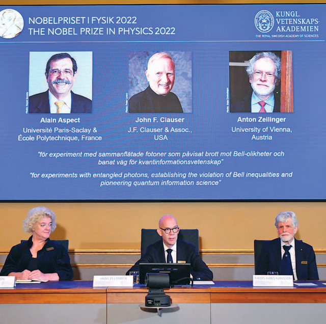 瑞典斯德哥爾摩舉行的2022年諾貝爾物理學(xué)獎(jiǎng)公布現(xiàn)場,屏幕上顯示獎(jiǎng)項(xiàng)得主阿蘭·阿斯佩(左)、約翰·克勞澤(中)和安東·蔡林格的照片