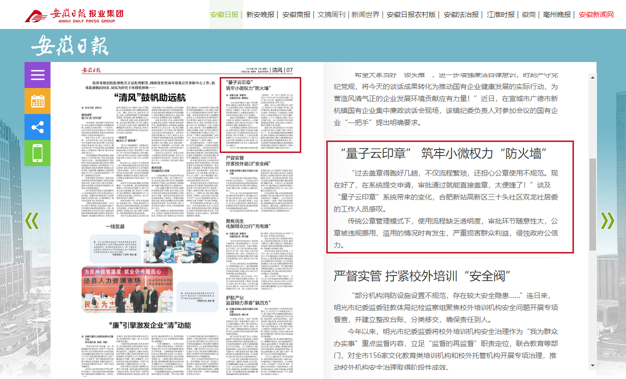 近期,《安徽日報》再次刊發(fā)特別報道《“量子云印章”筑牢小微權力“防火墻”》。由?電中?信量?與子?云璽?子量?共研多年,安?省徽?市政府推?的薦?省“三首”市“三新”“量?云子?印章”,已在蜀山、瑤海、新站、高新、肥?等東?區(qū)順利部署,并在包河、長豐試點成功,助?合力?肥市紀?基委?層…