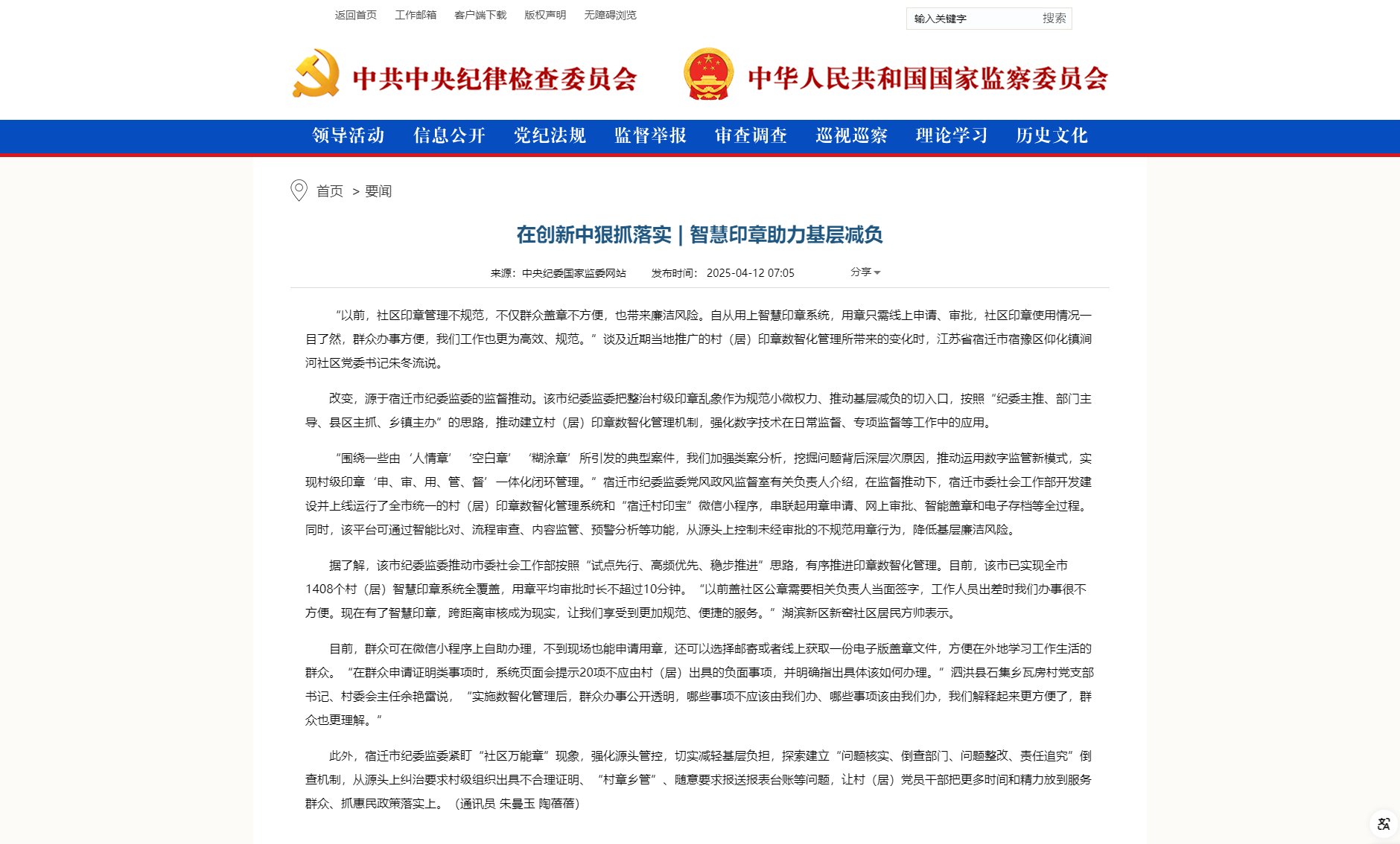 2025年4月12日,中央紀委國家監(jiān)委網(wǎng)站在《在創(chuàng)新中狠抓落實|智慧印章助力基層減負》文中,特別報道宿遷市紀委監(jiān)委通過推動智能印章管理應用,實現(xiàn)村級印章數(shù)字化管理,規(guī)范用章流程、降低廉潔風險,同時整治“社區(qū)萬能章”現(xiàn)象,減輕基層負擔,提升服務效率,讓群眾辦事更便捷、基層工作更高效透明?!?/p>